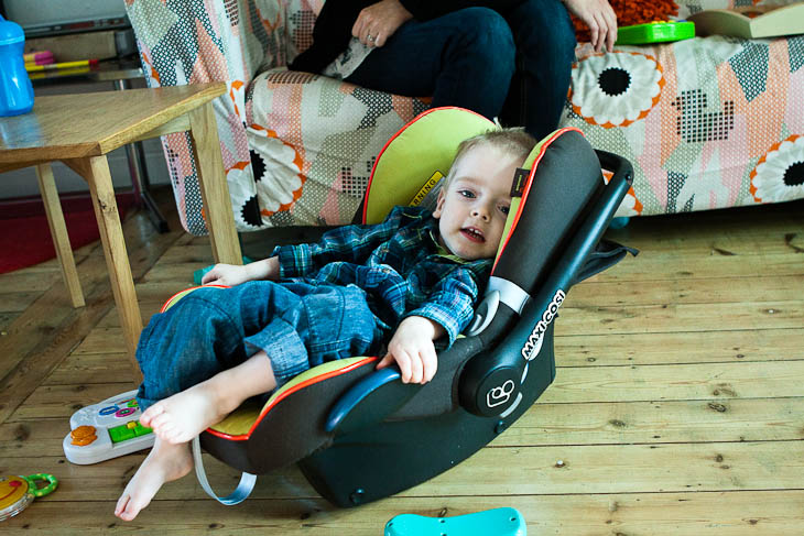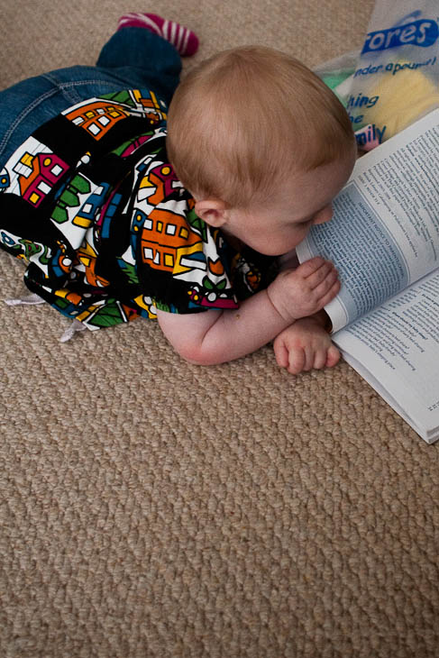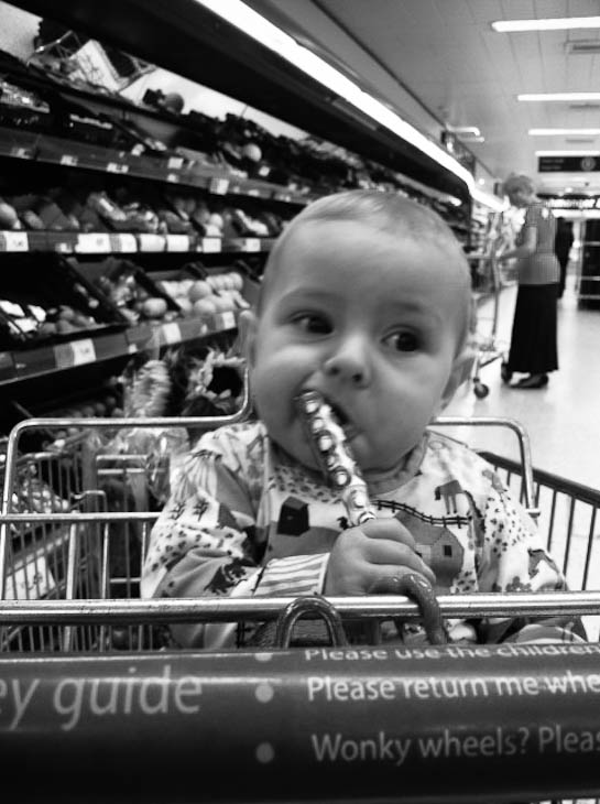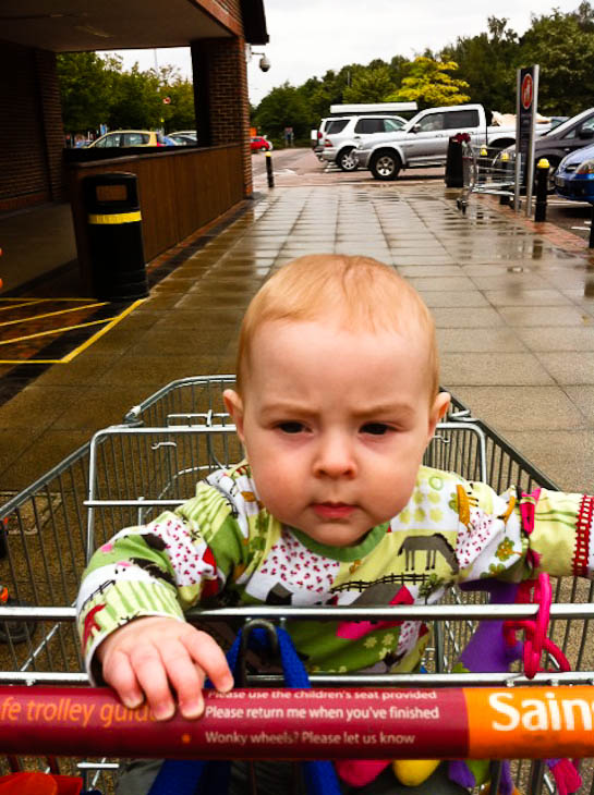 Mabel enjoys sitting in the seat of the trolley now, rather than perched on the top. Only problem is that she spends a lot of the journey sucking the bar in front of her. Tasty.