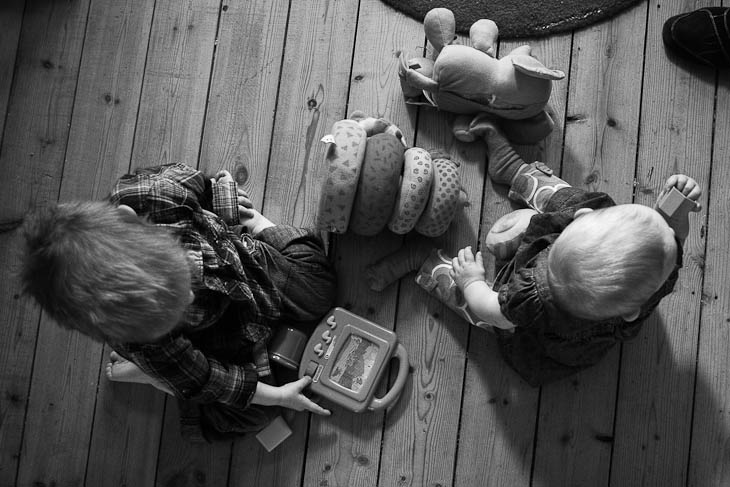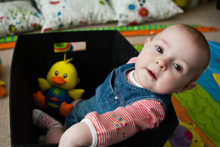 Mabel shared her toy box with the noisy duck.
