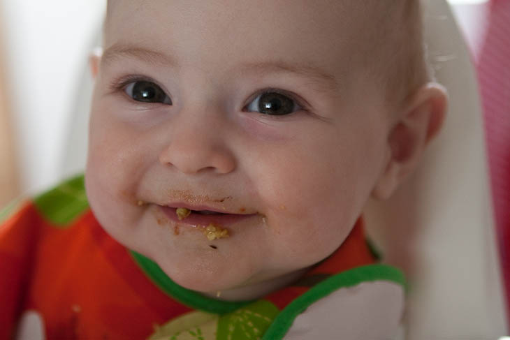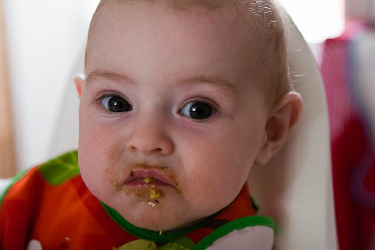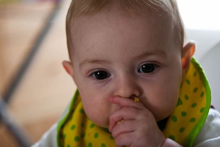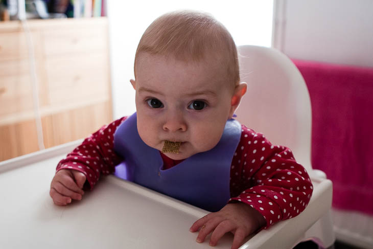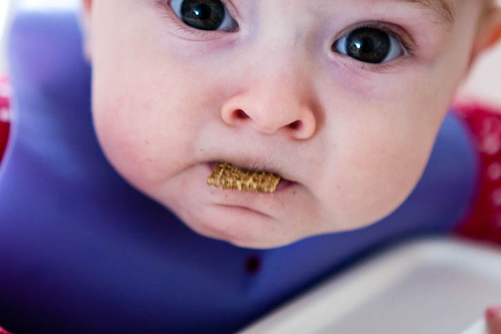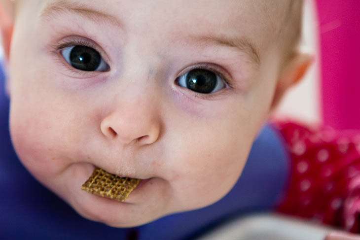 Mabel has a very special way of eating her Shreddies. She has them dunked into milk then she pops them in her mouth, sucks of the milk then the Shreddies gets sucked in too. Cute, but messy when she sneezes!