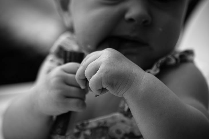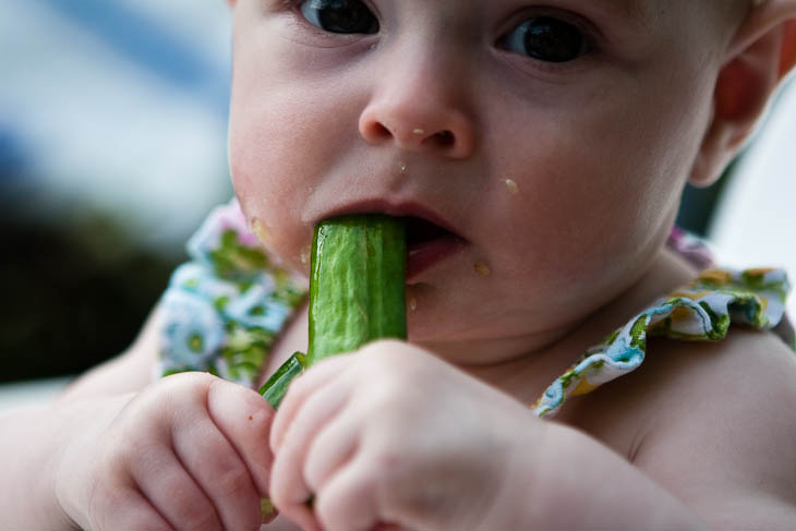 Cucumber is the favourite food of the day. We think it is because it is nice and cool against her gums.